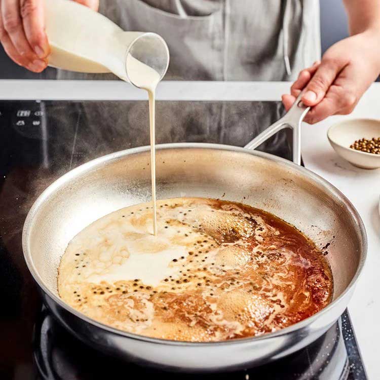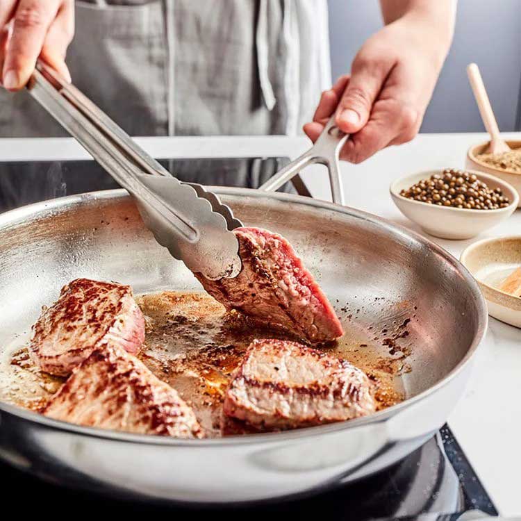Gemaakt met 5-lagenmateriaal tot aan de rand, biedt deze koekenpan uitstekende warmteverdeling voor een gelijkmatige garing. Ideaal voor alles, van het bruinen van vlees tot het bakken van aardappels.